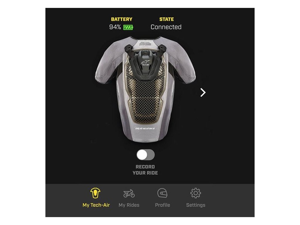 Systém Tech-Air® Race je samostatne fungujúce zariadenie, takže ho nie je potrebné žiadnym spôsobom párovať alebo fixovať lankom k motocyklu. To uľahčuje jazdcovi manipuláciu a dáva slobodu voľného pohybu. Systém je vybavený bezdrôtovým rozhraním Bluetooth, ktorý umožňuje priame prepojenie s mobilným telefónom pomocou Tech-Air® App.Aplikácia poskytuje dôležité informácie o airbagovom systéme a umožňuje užívateľovi prístup k mnohým ďalším funkciám.